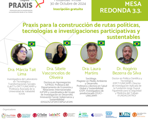 El objetivo de este espacio es entablar un debate e intercambios entre científicos, tecnólogos, referentes sociales y funcionarios públicos sobre las dinámicas de “praxis” en las cuales se integra la producción de conocimiento científico y tecnológico, la intervención socio-territorial, la formación y la incidencia en políticas públicas con la finalidad de generar transformaciones sistémicas sociales y ambientales desde y en el Sur Global. En especial, PRAXIS busca recuperar y capitalizar aquellos saberes, prácticas, aprendizajes, pedagogías de la praxis e insumos de política que fortalecen la ciudadanía socio-técnica y nuevos abordajes y visiones sobre el diseño e implementación de conocimientos, tecnologías o sistemas socio-técnicos y de procesos educativos emancipatorios orientados al Desarrollo Inclusivo Sustentable.